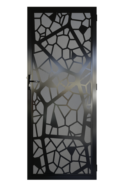 The Portarlington aluminium security door features a laser cut design that is bold and contemporary. Inspired by fractured stone or cracked earth, the laser-cut lines form an irregular network of geometric shapes, varying in size and angle to create a striking, organic mosaic effect.